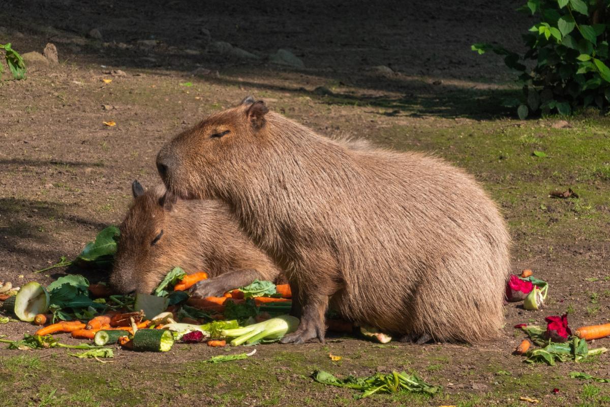 As capivaras podem comer algumas frutas e verduras, mas não costumam fazê-lo em seu habitar natural. Em cativeiro, podem ser oferecidas com moderação devido ao alto teor de açúcar.