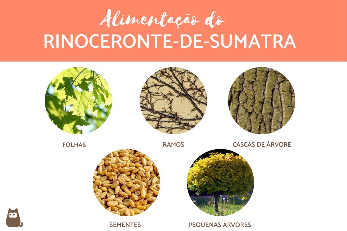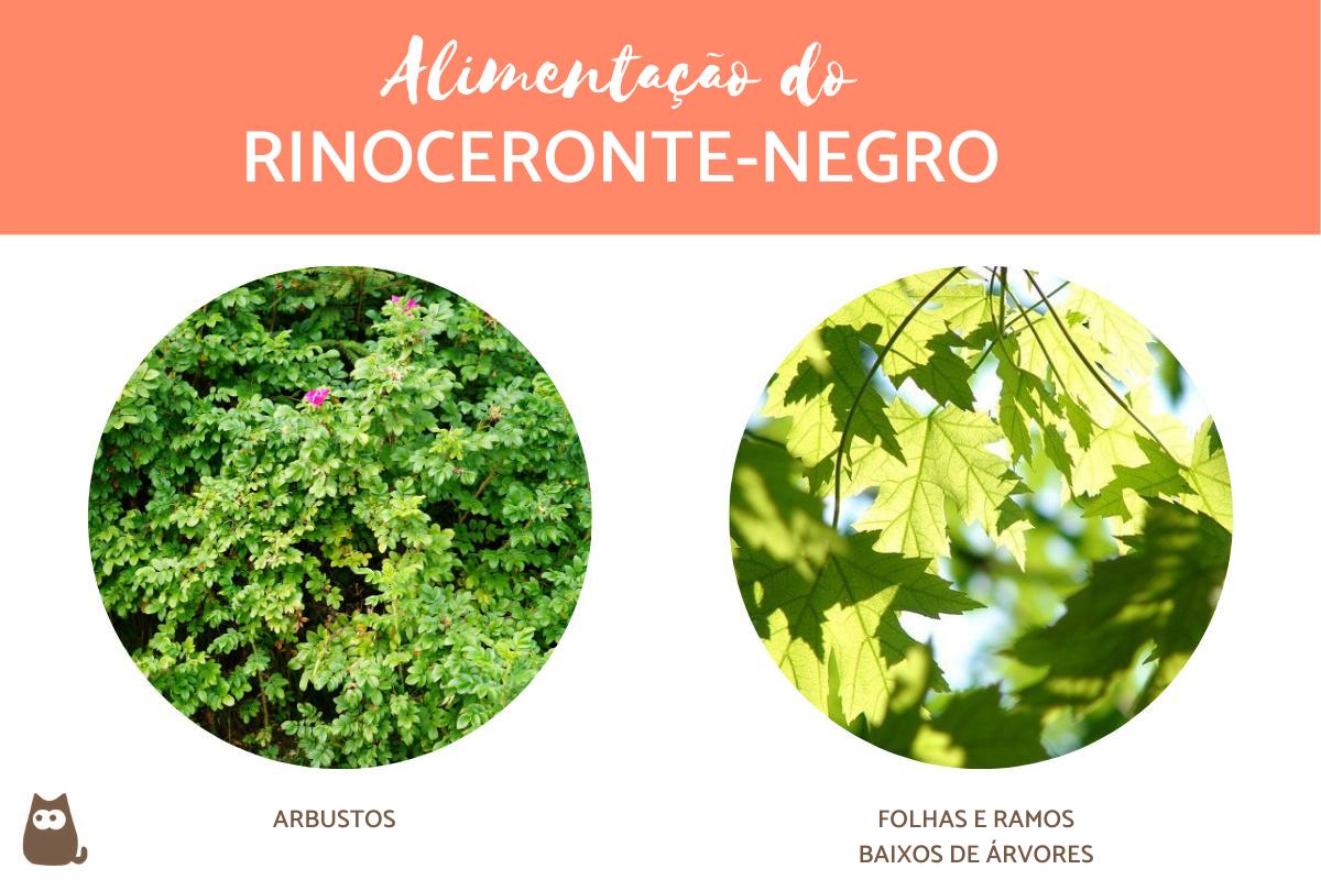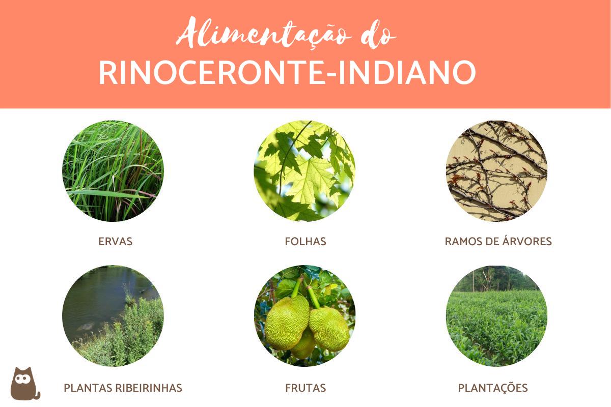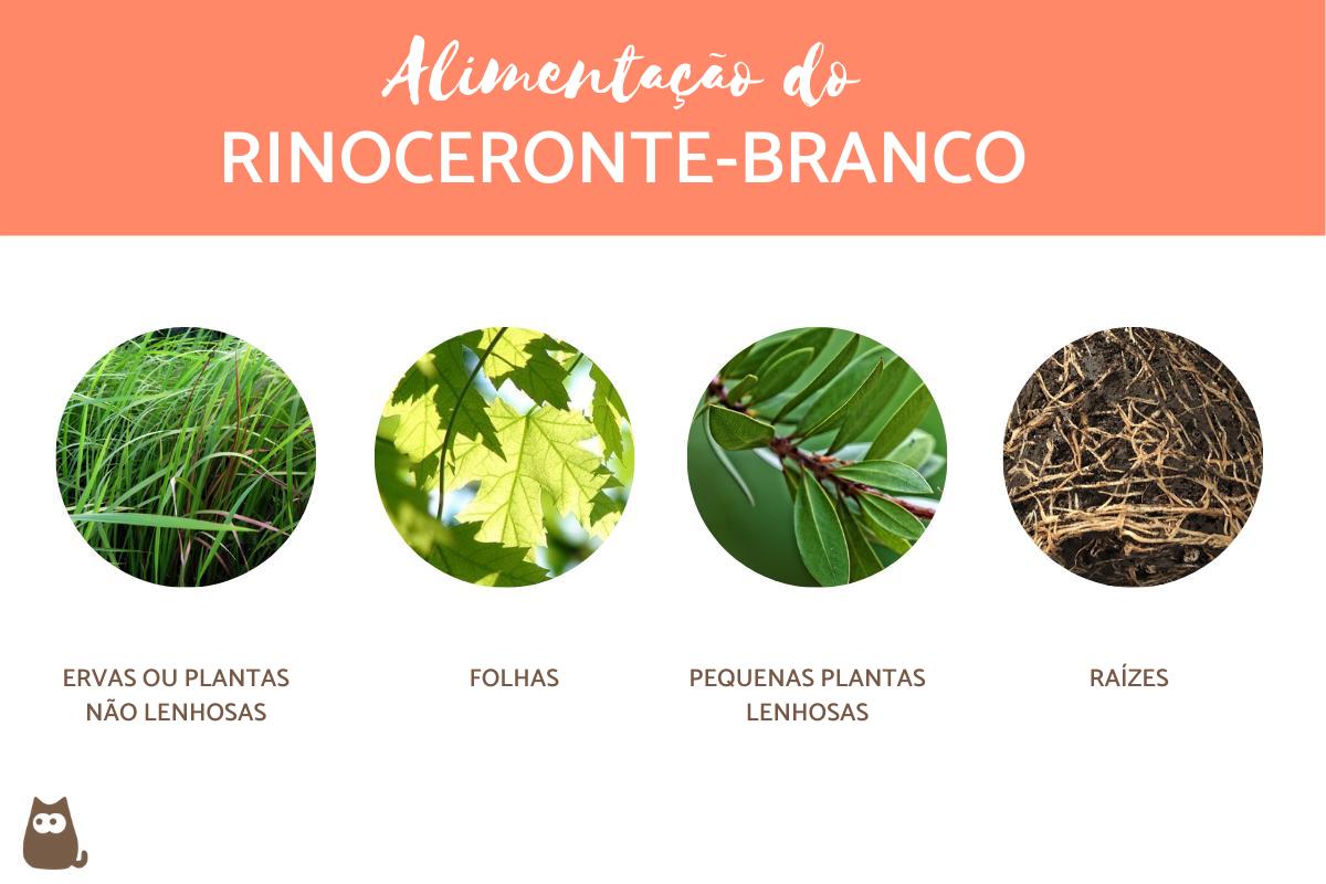 Os rinocerontes são animais herbívoros que, para manter seus corpos de grande tamanho, precisam consumir grandes quantidades de matéria vegetal, que podem ser partes macias e nutritivas das plantas, embora em casos de escassez comam alimentos ricos em fibras que processam em seu sistema digestivo.