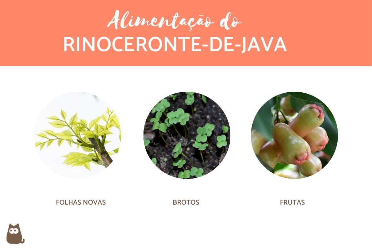 O rinoceronte-de-java se alimenta de folhas novas, brotos e frutos. Também precisam consumir sal para obter certos nutrientes, mas devido à ausência de reservas deste composto na ilha, tomam água do mar.