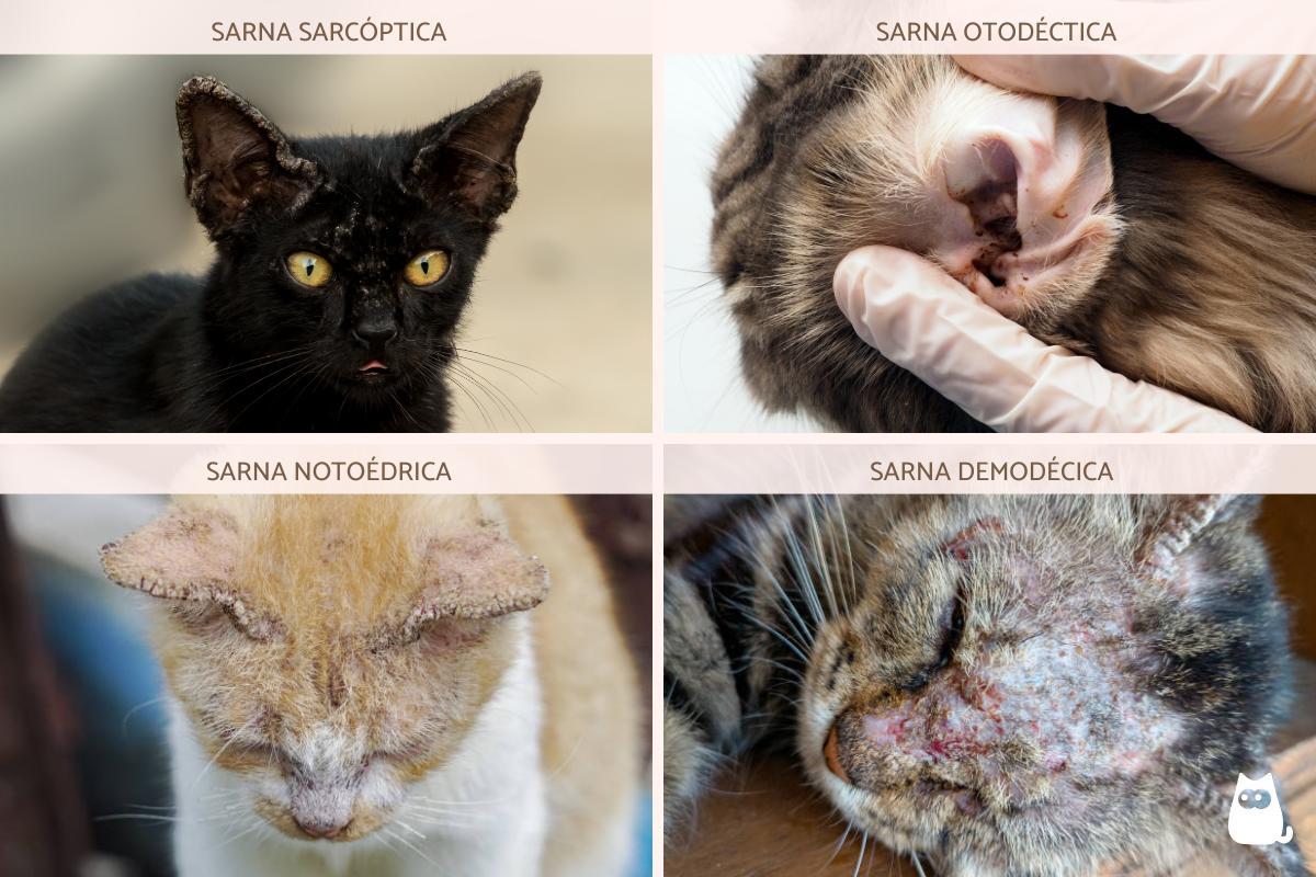 - Sarna notoédrica: causada pelo ácaro Notoedres cati, que provoca lesões com casquinhas na cabeça e no pescoço, sempre começando pelas orelhas;
