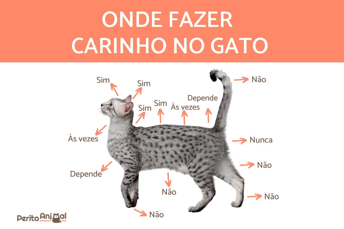 Agora que você já sabe o que significa quando o gato fica de barriga para cima e descobriu onde fazer carinho no gato, deixamos aqui para você um infográfico com indicativo dos lugares que usualmente eles amam ser tocados: