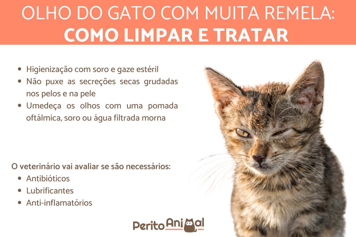 Inicialmente, o olho do gato remelando deverá ser higienizado com soro e uma gaze estéril. Nunca tente puxar secreções secas e grudadas nos pelos e na pele, pois isso pode ferir as pálpebras e causar mais dor ao animal. O ideal é umedecer os olhos com uma pomada oftálmica (Keravit, Epitezan ou Liposic) ou com soro e retirar as secreções amolecidas com muita delicadeza. Caso você não tenha acesso a esses medicamentos, pode usar um pouco de água filtrada morna.