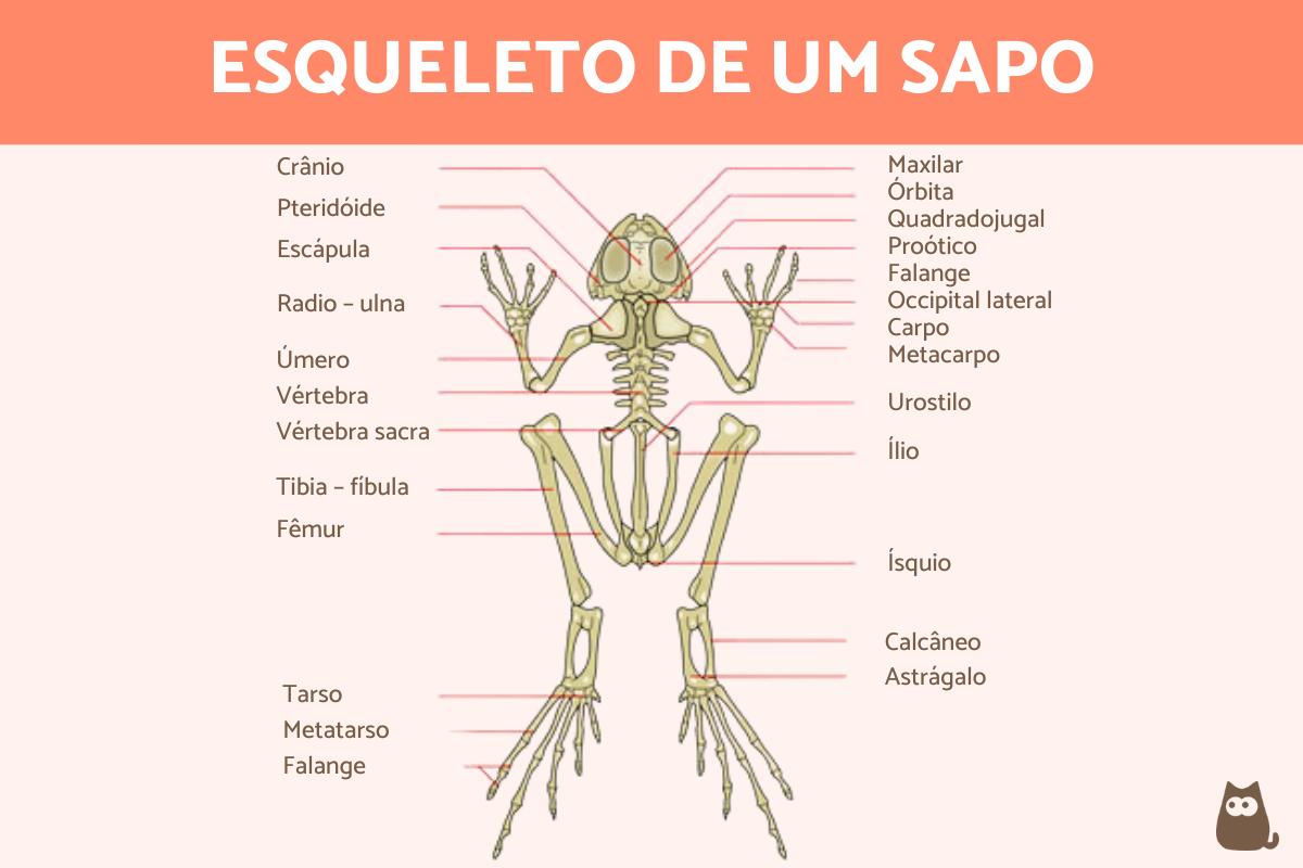 Agora que você já sabe que sapo tem osso, conheceu um pouco melhor sobre a estrutura óssea dos sapos, aqui deixamos uma infografia na qual, além da coluna vertebral de um sapo, você conhecerá vários outros tipos de ossos desses anfíbios: