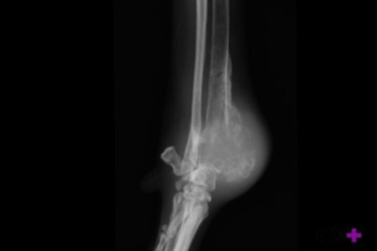 - Radiografia: lesões com margens irregulares e mal definidas, especialmente quando aparecem nos locais mais frequentes deste tumor, nos fazem suspeitar da existência do osteossarcoma canino. Além disso, as fraturas podem às vezes ser vistas na radiografia, pois uma pequena porcentagem de cães com osteossarcoma pode ter fraturas patológicas, ou seja, fraturas resultantes de danos ósseos causados pelo tumor. Vale mencionar que os exames de imagem permitem um diagnóstico presuntivo, mas para se chegar a um diagnóstico definitivo são necessários os seguintes exames: