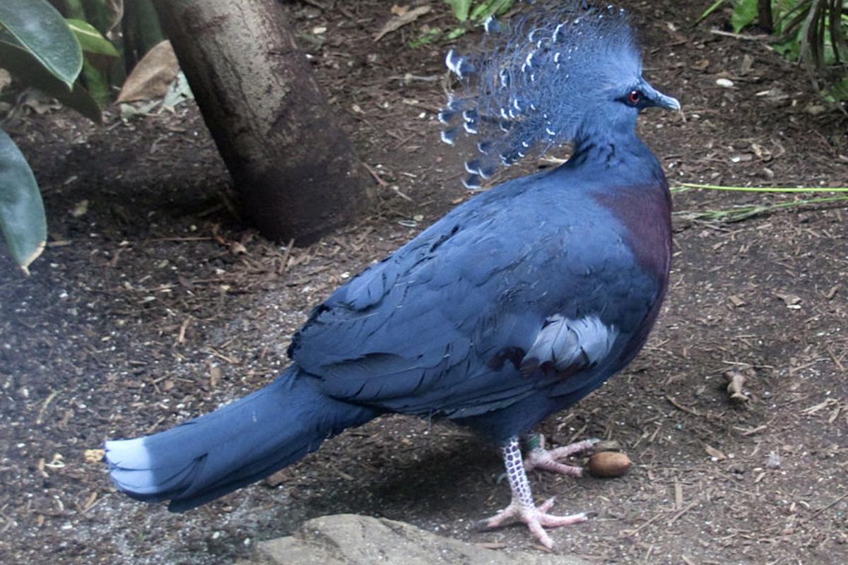 Repare bem, essa ave majestosa te lembra algo? Pois saiba que essa é uma espécie de pomba que habita as florestas da Nova Guiné. Sua paleta de cores conta com tons de azul, cinza e roxo, olhos vermelhos e uma crista azul e delicada.