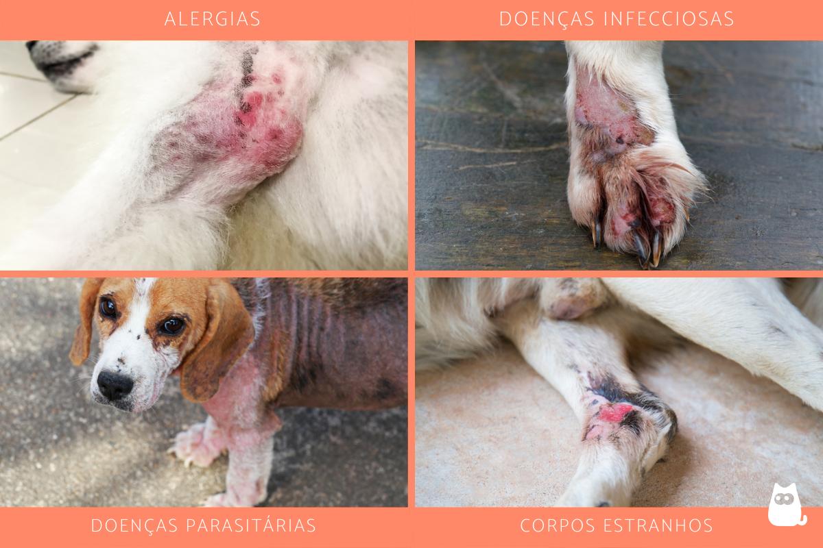 - Dermatofitose: trata-se de uma infecção causada por fungos dos gêneros Microsporum e Trichophyton. Geralmente, as lesões avermelhadas e arredondadas aparecem em áreas com alopecia.