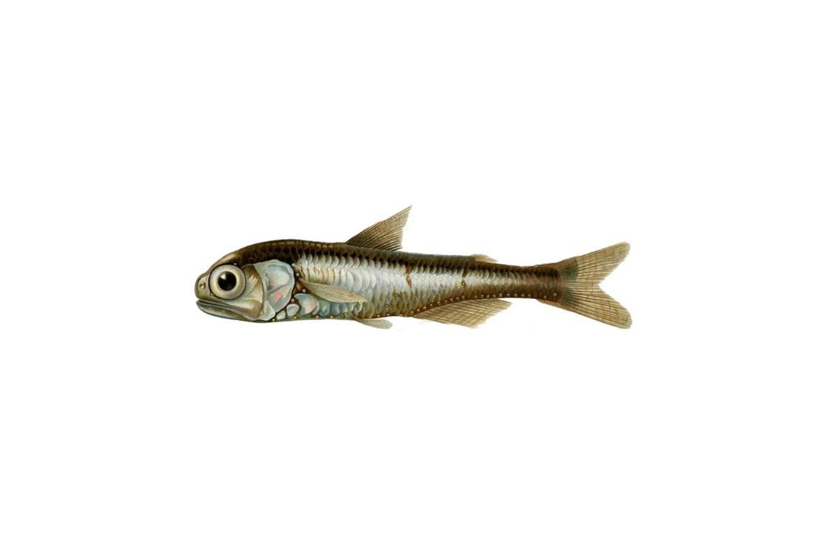 Desloca-se por diferentes profundidades entre o dia e a noite. De cor prateada, os machos medem cerca de 8 cm e as fêmeas cerca de 5 cm. É classificado como de Menor Preocupação.