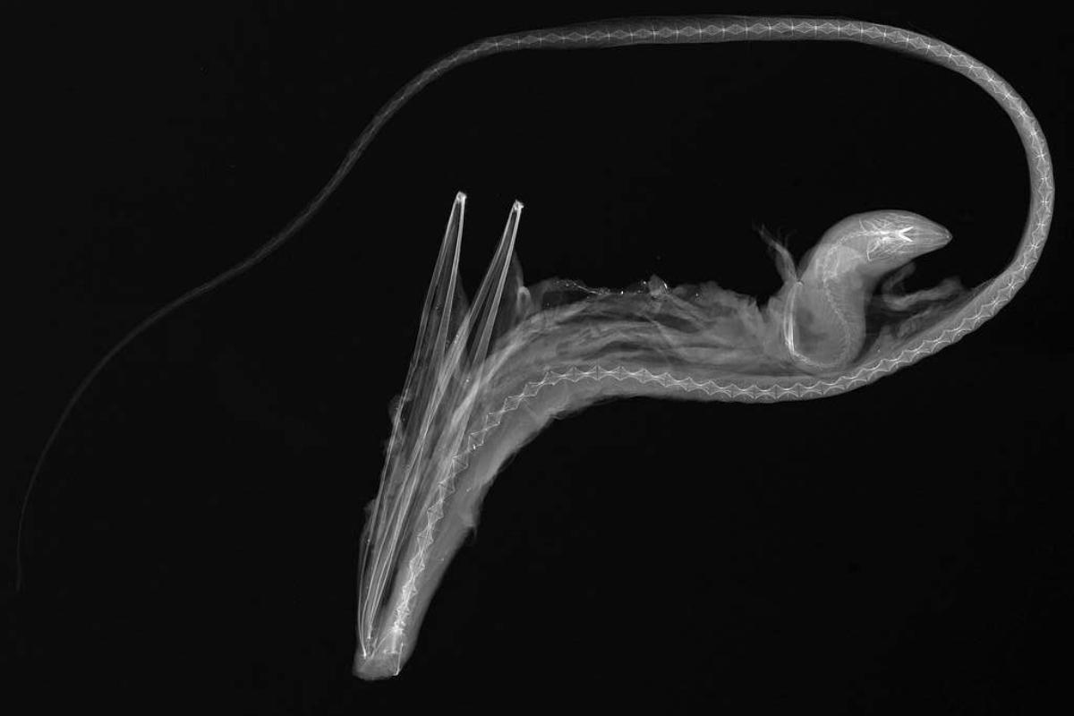 Os machos, por sua vez, estão sempre em grandes profundidades, entre 1000 a 2000 m. Também há dimorfismo sexual: as fêmeas medem cerca de 35 cm, apresentam cor preta sólida e têm dentes bem desenvolvidos. Os machos crescem apenas 5 cm e apresentam características larvais. A fêmea às vezes é comparada com a famosa personagem do filme "Alien". É classificada como de Menor Preocupação.