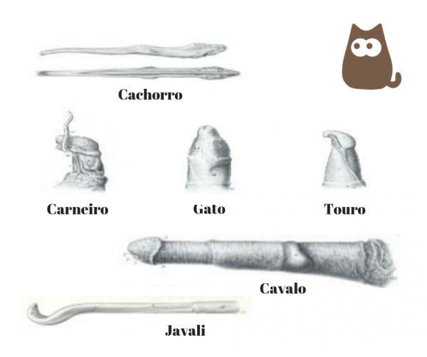 É muito raro conseguir você observar o pênis de um gato a não ser quando você o flagra se lambendo ou ele apresenta alguma anomalia. O pênis do gato não castrado possui uma característica única que o distingue de grande parte das outras espécies: ele apresenta pequenas projeções queratinizadas, chamadas de espículas, que provocam dor à fêmea durante a cópula e que têm como função induzir a ovulação. Sendo por isso que os gatos fazem tanto barulho quando cruzam. Depois de castrados, os gatos perdem essas espículas e o pênis fica com uma aparência lisa. Na imagem em baixo você pode distinguir a anatomia do pênis das diferentes espécies: