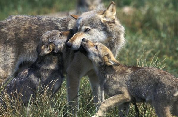 Quando os filhotes reparam a chegada do grupo de adultos provedor saem apressados e excitados da toca e começam a lamber compulsivamente os focinhos dos adultos caçadores. Estas lambidas incessantes geram no animal adulto um reflexo nervoso que estimula uma zona determinada do cérebro que induz e provoca o vômito e a consequente regurgitação da comida engolida anteriormente. É aí quando os filhotes começam a alimentar-se. É simples imaginar a rapidez com que esse hábito se fixa no cérebro do filhote.