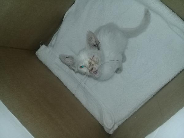 Um gato filhote apareceu na frente da minha casa, com os mesmos sintomas do Herpesvírus felino tipo 1. Eu limpei o excesso de remela com água misturada com algumas gotas de limão, passei um pouquinho de kollagenase também. Dei um pouquinho de leite morno em uma seringa, mas ele não quis muito.