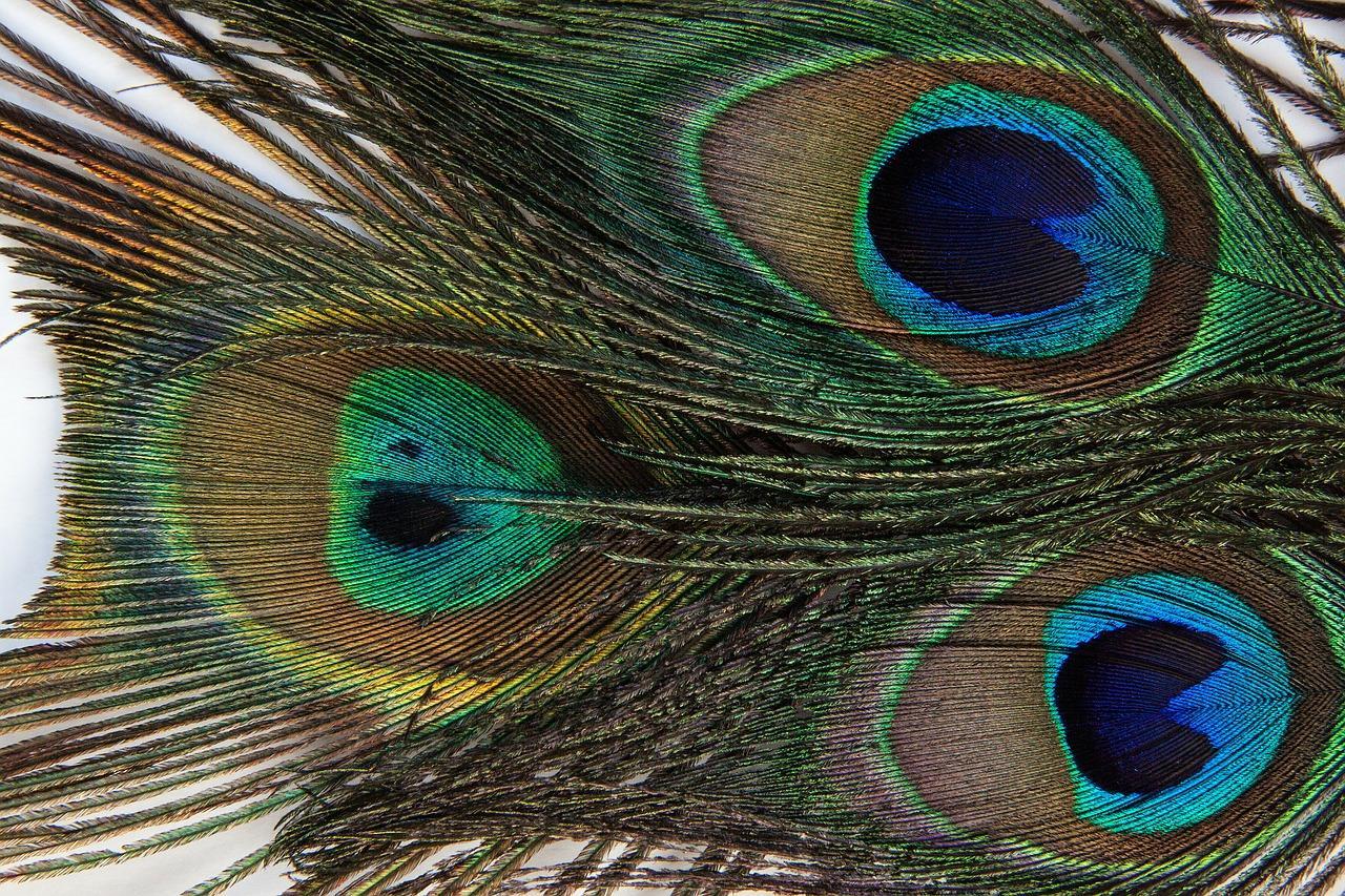 - Estas penas apresentam uma espécie de óculos virados para a ponta da cauda, capazes de mudar de cor ao mover-se devido às fibras que compõe as penas.