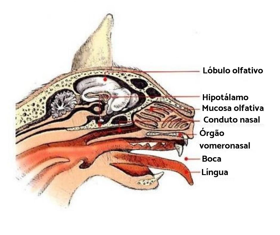 Nos mamíferos, os feromônios são detectados através do órgão Vomeronasal ou órgão de Jacobson, localizado na boca, no final do céu da boca duro, por isso é normal ver um gato cheirar algo com a boca aberta.
