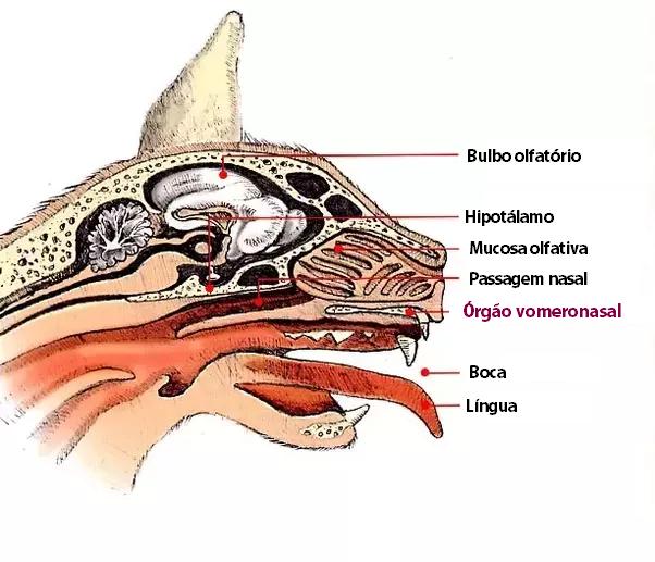 Os gatos detectam substâncias que não são voláteis, nomeadamente feromônios. Essas substâncias químicas enviam mensagens através de estímulos nervosos para o cérebro que, por sua vez, os interpreta. Isto permite que eles recebam informações do grupo social deles e possam detectar o cio das gatas, por exemplo.