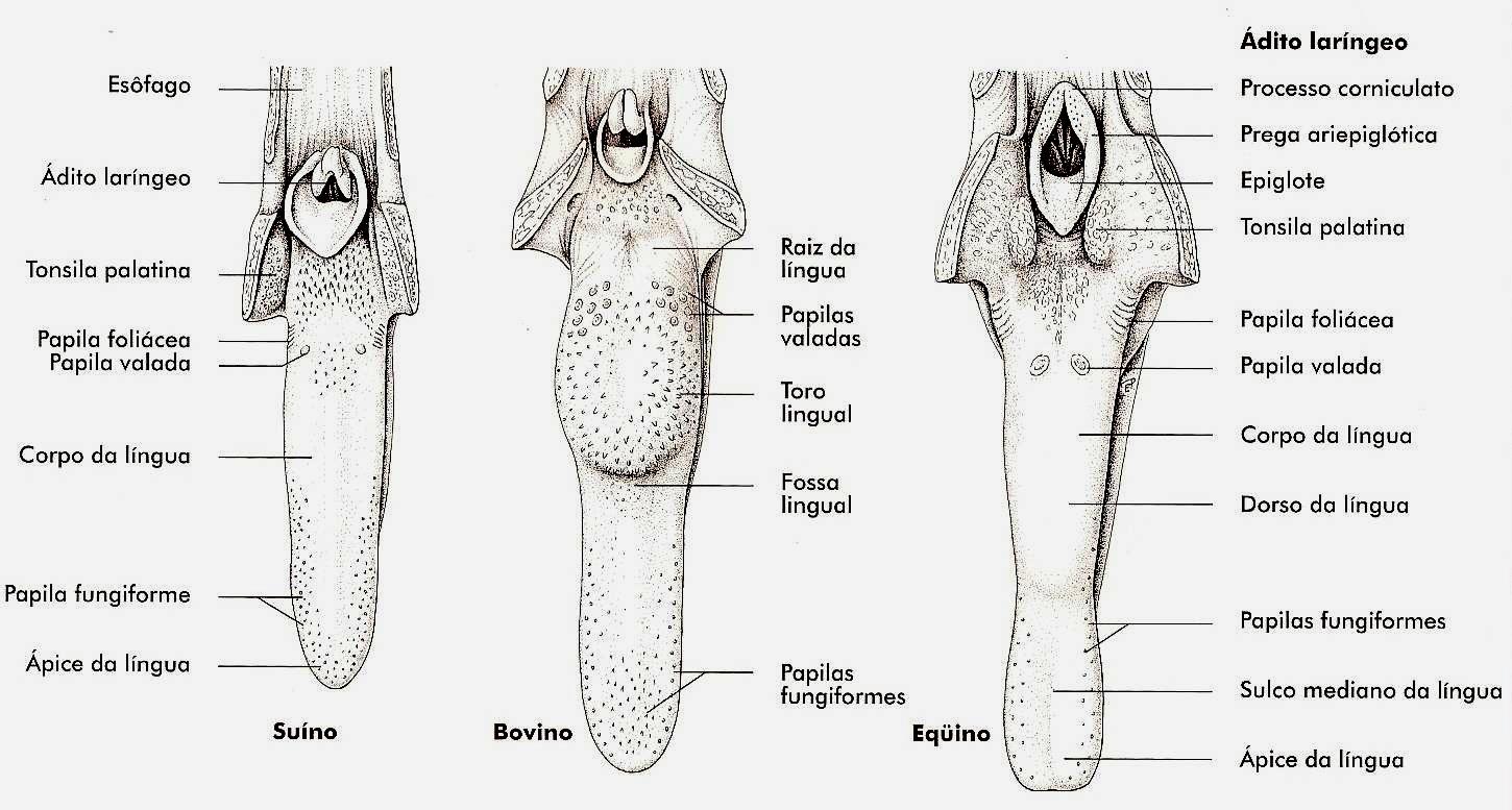 Também o formato e a anatomia da língua é ligeiramente diferente conforme a espécie (você pode ver na imagem exemplos da língua de porco, vaca e cavalo). Por exemplo, no caso das vacas, a língua tem uma função muito importante na preensão dos alimentos! Elas têm uma elevação na língua chamada de "toro lingual" (veja na imagem) que pressiona o alimento contra o palato duro, o que é uma grande ajuda na mastigação.