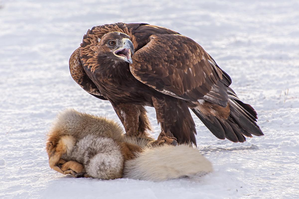 - Visão. Seus olhos grandes e orientados para frente proporcionam uma visão binocular excepcional, permitindo-lhes calcular distâncias com precisão. Além disso, sua visão aguçada permite detectar movimentos mínimos no solo, o que é crucial para localizar presas, incluindo a raposa;