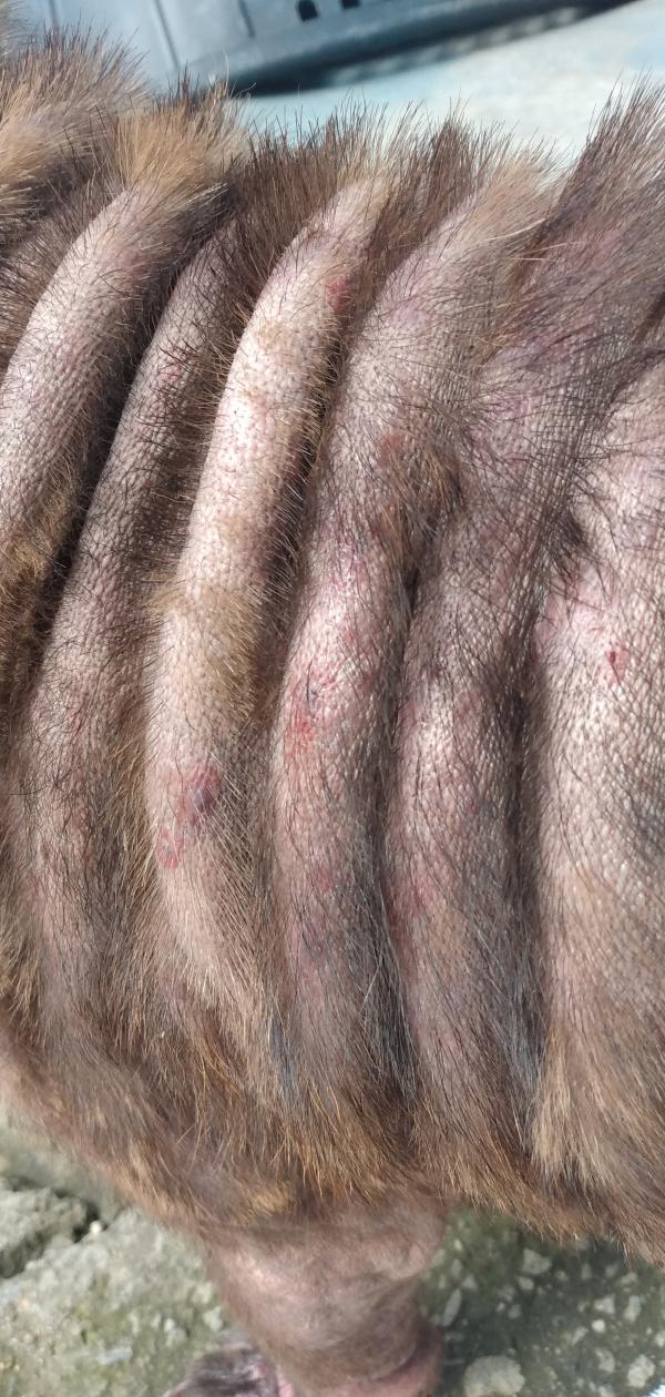 Tenho uma shar pei de 1 ano lo pelo todo caiu e começo a formar bolhas de sangue muito nas costas e patas dou banho de 2 em 2 dias com sabonete matacura e protex seco bem mas a cada novo banho aparece uma ferida não sei mais o que fazer ela está tomando antibiótico e Glicopan mas não vejo melhoras não tem pelo mais o que fazer
