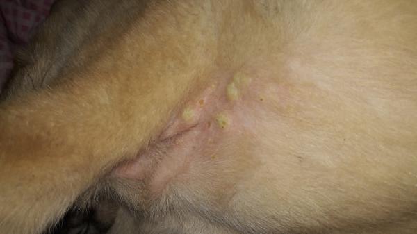 Meu sharpei está com essas bolhas e soltam uma gosma sem cheiro  parece não incomoda lo ele não coça o local gostaria de saber o que pode ser