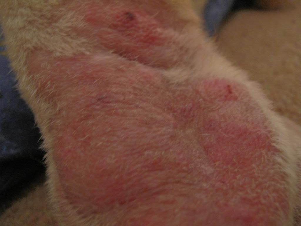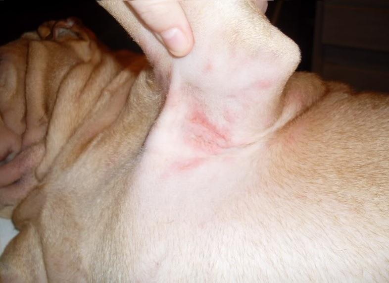 Minha sharpei tem 3 meses e meio, recentemente após uma a ingestão de um petisco com corante (que não nos atentados), ela começou a ter irritações. Primeiramente, apareceu umas bolinhas com pus embaixo do pescoço e posteriormente umas feridas que criou uma casca esverdeada. O que será?
