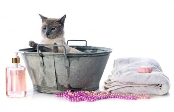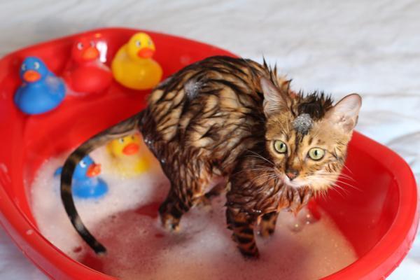Uma vez que estes pequenos avanços tenham sido feitos, podemos nos atrever a começar um banho. Para isso, escolha um horário em que você tenha tempo e esteja tranquilo ou tranquila. Se você estiver sob influência de estresse, transmitirá isso para o gato e a experiência será negativa. Você pode segurá-lo pela pele superior no pescoço, assim como os gatos carregam seus gatinhos. Fale com ele suavemente e despeje água sobre ele com o chuveiro no mínimo, com algum tipo de recipiente para evitar ruídos ou com sua mão. A água deve estar morna. Se ele reagir de forma agressiva ou se ficar excessivamente estressado, pare o banho. É melhor recomeçar do zero em outro momento. É uma questão de progredir até que você possa aplicar o shampoo, enxaguá-lo e secá-lo.