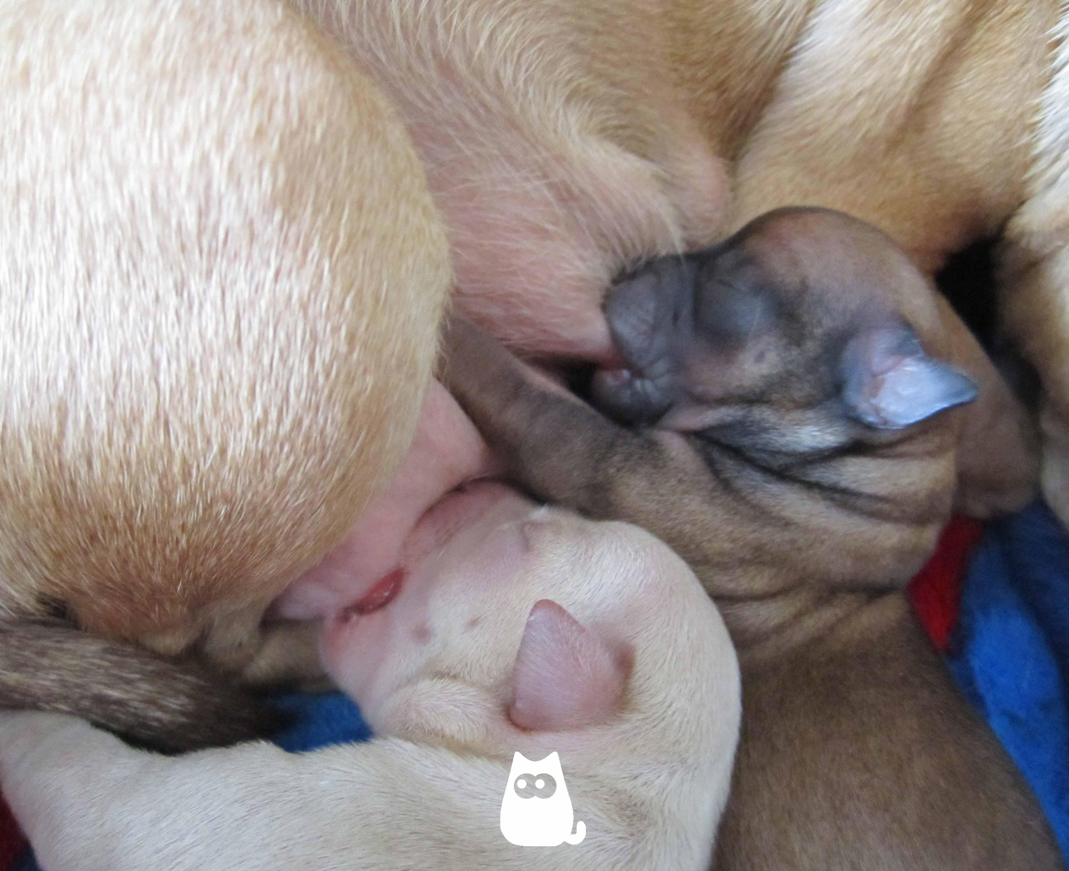 O sistema nervoso central também está em desenvolvimento quando eles nascem. Durante os primeiros dias, utilizam o sentido do tato para se guiarem desajeitadamente até suas mães, que lhes proporciona calor e alimento. De fato, dependem dela para tudo, até para fazer suas necessidades, pois a cadela os estimula através das lambidas. Assim, durante esse período, é normal que os filhotes não abram os olhos.
