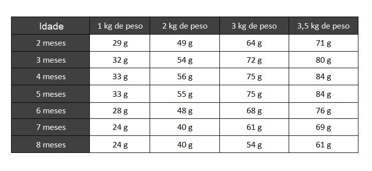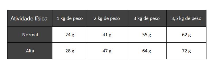 Em seguida mostramos-lhe uma tabela específica de alimentação para cachorros Junior, evidentemente a quantidade poderá variar dependendo da marca do produto escolhido, por esse motivo recomendamos que consulte a tabela da embalagem ou consulte o seu veterinário.