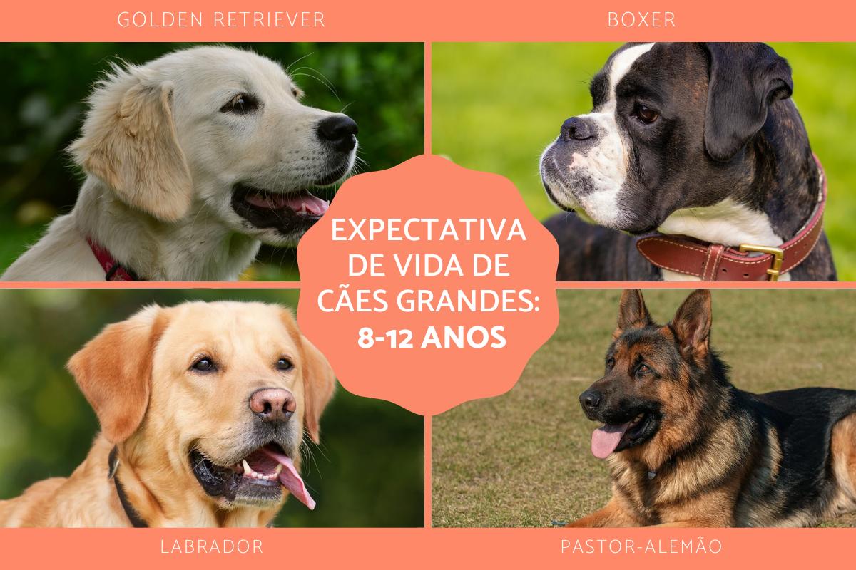 Os cachorros de grande porte, como o pastor alemão, boxer, labrador ou golden retriever, têm uma expectativa de vida de 8-12 anos. No caso de raças gigantes, como as mastiffs, terra-nova ou dogue alemão, a expectativa de vida é reduzida para 6-11 anos.