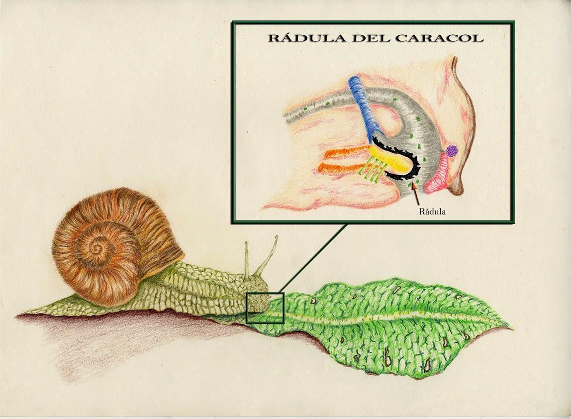 - Rádula: a característica mais distintiva e essencial da cavidade bucal do caracol é a rádula. Como mencionamos antes, esta é uma estrutura semelhante a uma língua, formada por uma fila flexível e estreita revestida por pequeninos "dentes" chamados odontóforos. Esses dentes estão dispostos em fileiras ao longo da rádula e variam em forma conforme a espécie e a dieta. É usada pelos caracóis para raspar, triturar e manipular o alimento. À medida que a rádula se move para a frente e para trás, os dentes raspam e desintegram o alimento em partículas menores que podem ser digeridas mais facilmente;