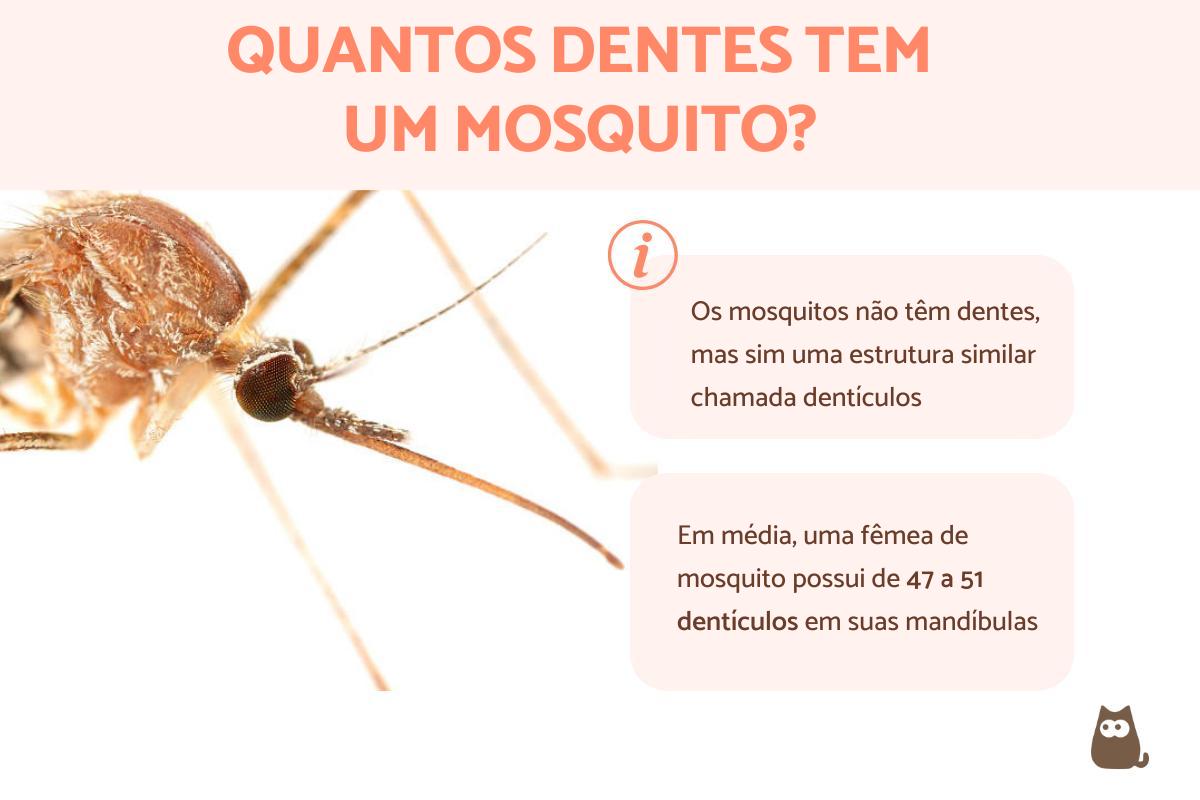 Os mosquitos possuem pequenas protuberâncias chamadas "dentículos" em suas mandíbulas, que funcionam de maneira semelhante aos dentes em outros animais. O número de dentículos varia entre as espécies de mosquitos, mas, em média, uma fêmea de mosquito possui de 47 a 51 dentículos. Por exemplo, algumas espécies do gênero Culex podem ter entre 8 e mais de 50 dentículos, e gêneros como Aedes podem ter até 16 dentículos. Saiba mais sobre os "Tipos de mosquitos" neste outro artigo.