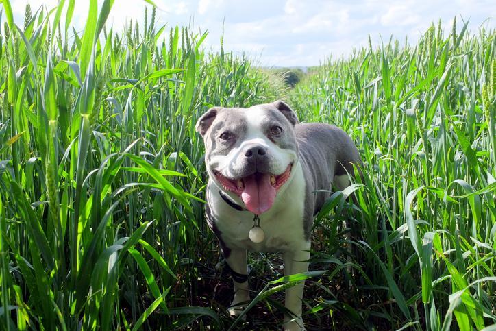 Outro cachorro do tipo bull que também faz parte da lista de raças de cachorros cinzentos é o Staffordshire Bull Terrier, muito menor que o anterior. Pode ser leonado, tigrado ou de uma única cor. Dentro da faixa de cores sólidas aceitas, está o azul, que também pode aparecer combinado com o branco.