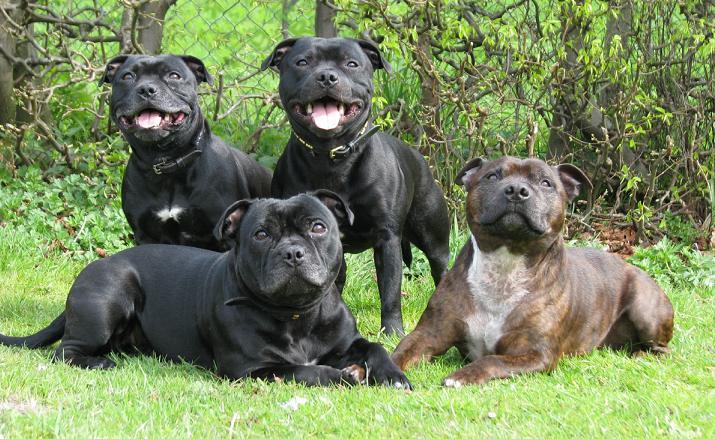 Também conhecido como "Staffy", esse cachorro é um pouco menor do que o Pitbull pois o seu peso varia entre 11 e 17 quilos. Além disso, se destaca por possuir um corpo compacto, musculoso e ágil. Como os outros terrier do tipo bull, o Staffordshire Bull Terrier tem uma personalidade muito amigável, tanto com outros cachorros como com outros animais de companhia mas, se destaca especialmente pela boa convivência com crianças, sendo conhecido como um dos melhores cachorros babá.
