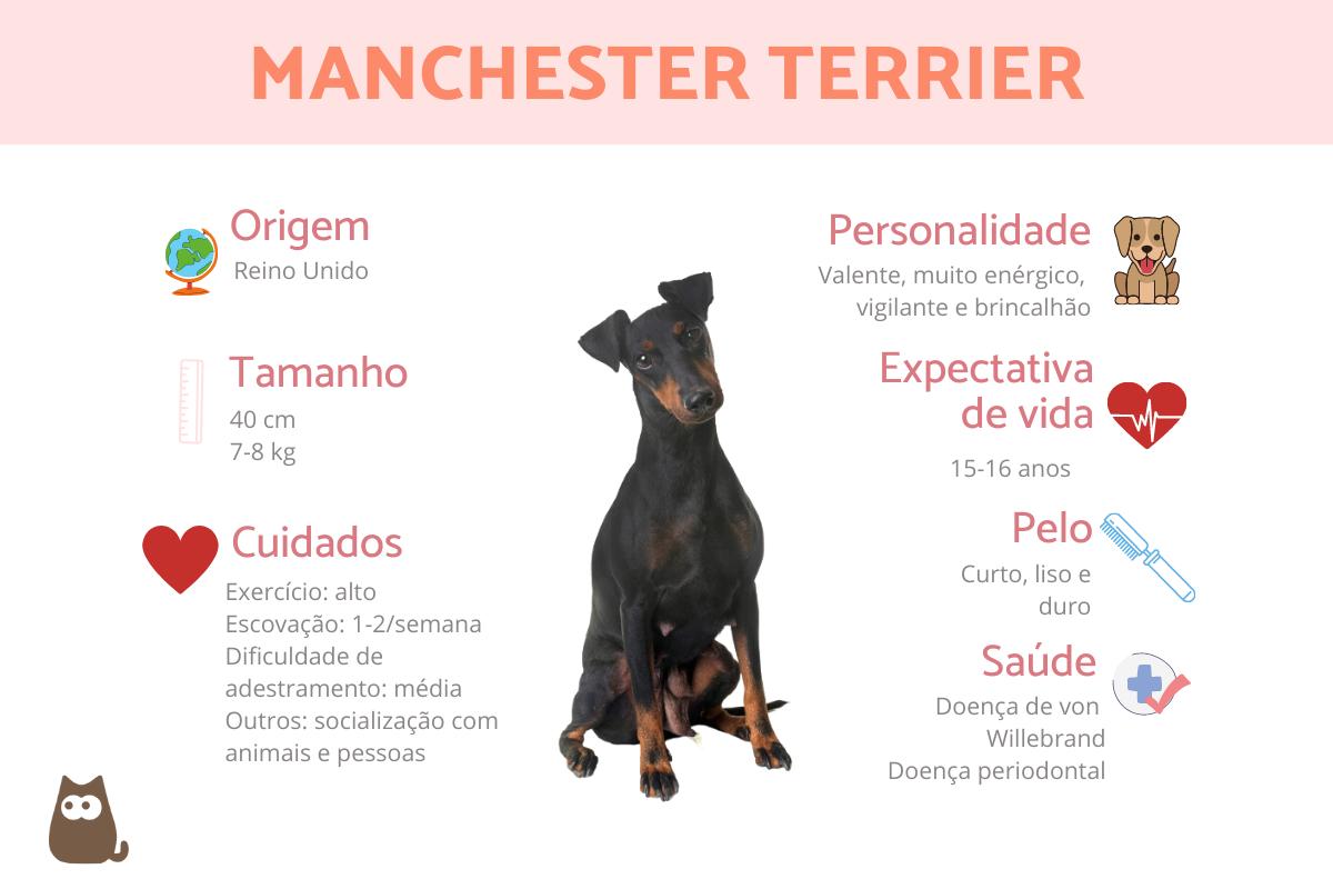 Criado no século XIX para perseguir e capturar ratos e camundongos, o manchester terrier é um caçador e um vigilante implacável, com muita energia e um caráter corajoso e afável com sua família humana, inclusive com as crianças. Se você gosta de cães pequenos e flexíveis, o manchester terrier irá conquistar seu coração, pois ele se adapta tanto à vida rural quanto à urbana, desde que suas necessidades sejam adequadamente atendidas, isto é, não apenas de exercício físico, mas também de estimulação mental.