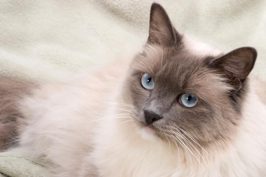 O ragdoll é outro gato de aparência semelhante ao siamês e, talvez, o mais popular entre as raças de gatos brancos e cinzas. Nasceu na Califórnia, Estados Unidos, em 1960, mas as associações felinas não o reconheceram até 1970. É caracterizada por apresentar um corpo longo e musculoso, de aparência fofa graças à pelagem abundante.