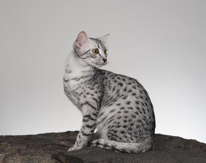Embora ainda haja dúvidas sobre sua origem, acredita-se que esta raça vem dos mesmos gatos que eram adorados no antigo Egito. O gato mau egípcio chegou à Europa e aos Estados Unidos em meados do século XX, quando este gato tigrado deixou todos surpresos com seu padrão de listras e manchas escuras sobre um fundo cinza, bronze ou prata. Destaca-se a parte inferior mais branca de seu corpo, assim como a ponta preta de sua cauda.