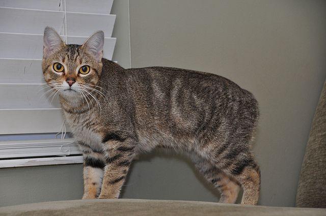O gato pixie-bob é outro gato tigrado da nossa lista e foi selecionado nos Estados Unidos durante os anos 1980. Assim, foi obtido um felino de tamanho médio com uma cauda muito reduzida, que pode ter pelos curtos ou longos. É sempre de tons marrons e é coberto por manchas escuras, atenuadas e pequenas. Sua garganta e barriga são mais esbranquiçadas e podem ter tufos pretos nas pontas das orelhas, como linces.