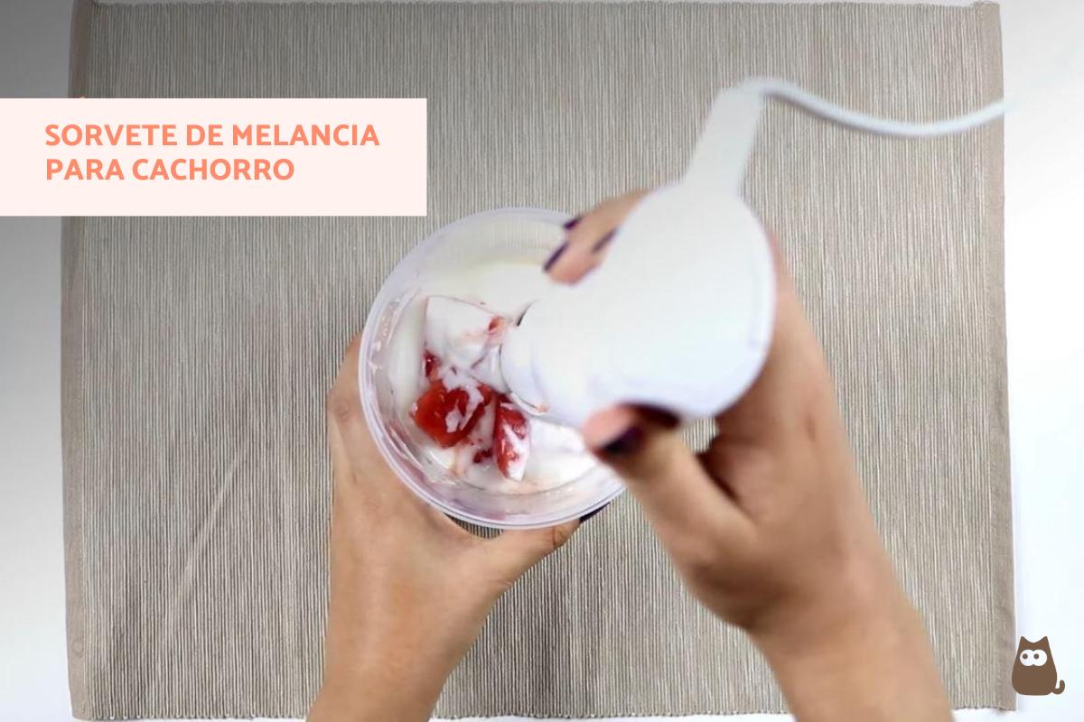 A melancia é uma fruta muito rica em água, tornando-se perfeita para fornecer hidratação extra ao cão quando está mais quente. Junto com o iogurte, você pode preparar este sorvete para cachorro perfeito: