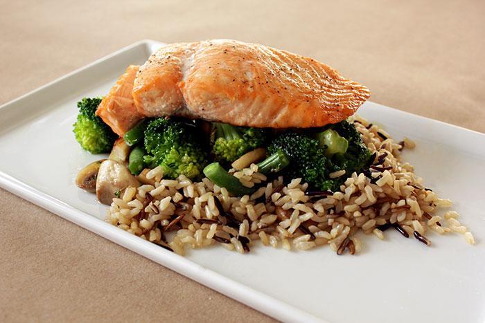 - Refogue ou asse o salmão e os legumes, polvilhando a salsa por cima.
