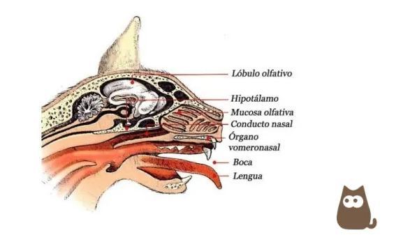 - O animal se aproxima da área com a sinalização olfativa, abre a boca, levanta o lábio superior e inspira para conduzir o ar até o órgão vomeronasal. Portanto, se você observar seu gato abrindo a boca quando cheira algo, saiba que ele está iniciando esse mecanismo;