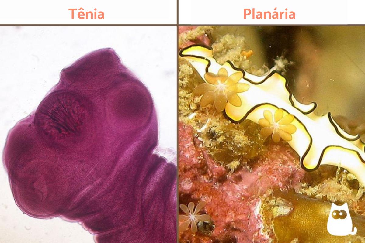 - Tênia (Taenia solium): enorme verme plano que parasita os porcos e os seres humanos.