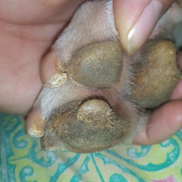 Alguém sabe dizer oque pode ser isso que cresceu na pata do meu cachorro ? Parece uma junção de pelos e carne ou uma deformação na almofada da pata ,parece ser igual ao tecido da almofada da pata só que nascendo de forma anômala .