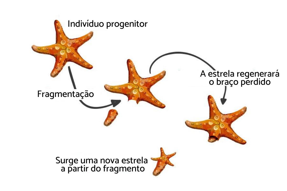 Alguns animais podem se reproduzir por fragmentação. Nesse tipo de reprodução, um animal pode se dividir em um ou mais pedaços e, a partir de cada um desses pedaços, um novo indivíduo completo se desenvolve. O exemplo mais típico pode ser observado no ciclo de vida da estrela do mar, porque quando perdem um braço, além de poder regenerá-lo, deste braço também se forma um novo indivíduo, que é um clone da estrela original.