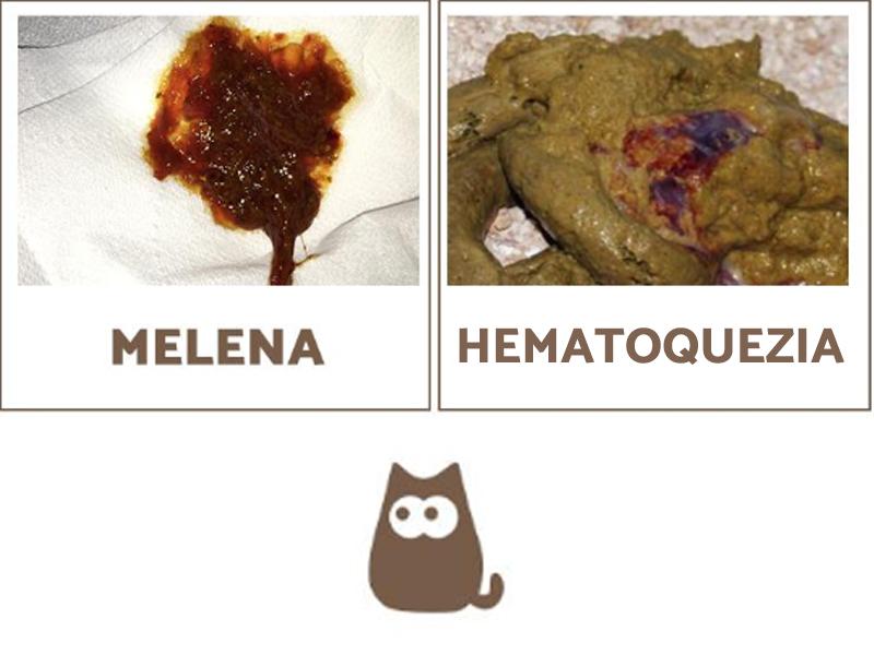 - A melena é a presença de sangue digerido nas fezes: o sangue tem uma cor escura, mau cheiro e tem geralmente aparência de alcatrão. Este sangue foi digerido e vem das partes superiores do sistema digestivo. A melena é mais fácil de ver que a hematoquezia porque pela cor escura das fezes de muitos cachorros é complicado dizer se há ou não sangue. Se você tem dúvidas, pode colocar as fezes do seu cachorro em papel de cozinha absorvente branco, se uma coloração avermelhada se espalhar no papel é muito provável que o seu cachorro tenha melena.