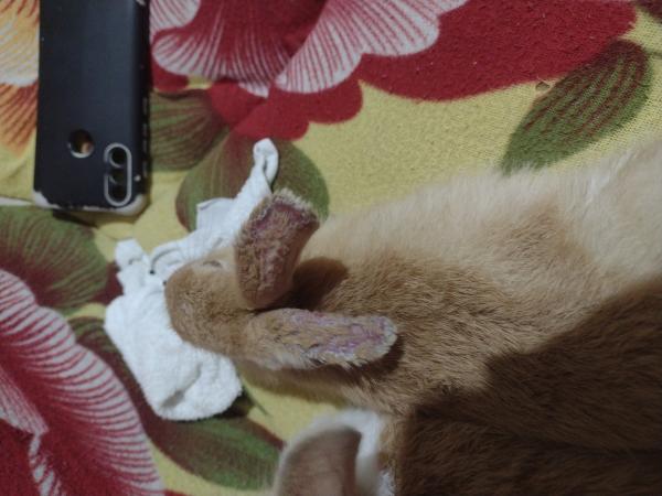 O branquinho estava com sarna sarcóptica, indicaram violeta, usei e as crostas caíram, ele era da minha sobrinha. Ela ganhou a dupla e o branco já veio infectado, começou na patinha chegou as orelhas e outras patas. Não usem violeta, após aplicar ele ficava inquieto e nao parava de correr e se limpar. Pena que foi tarde e nao pudemos levar ao veterinário. Estamos tristes pela perca, ele era dócil demais.