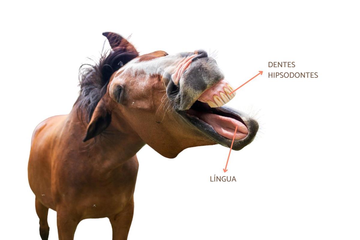 - Dentes: os cavalos possuem dentes hipsodontes, ou seja, que possuem coroas dentais elevadas, e são característicos de animais que consomem grandes quantidades de fibra vegetal. Ao possuir coroas elevadas, compensa-se o desgaste causado pelo tipo de alimentação. Além disso, esse tipo de dentes continua crescendo ao longo da vida do animal. Os dentes desempenham um papel crucial na mastigação e trituração do alimento, facilitando assim a digestão da fibra vegetal;