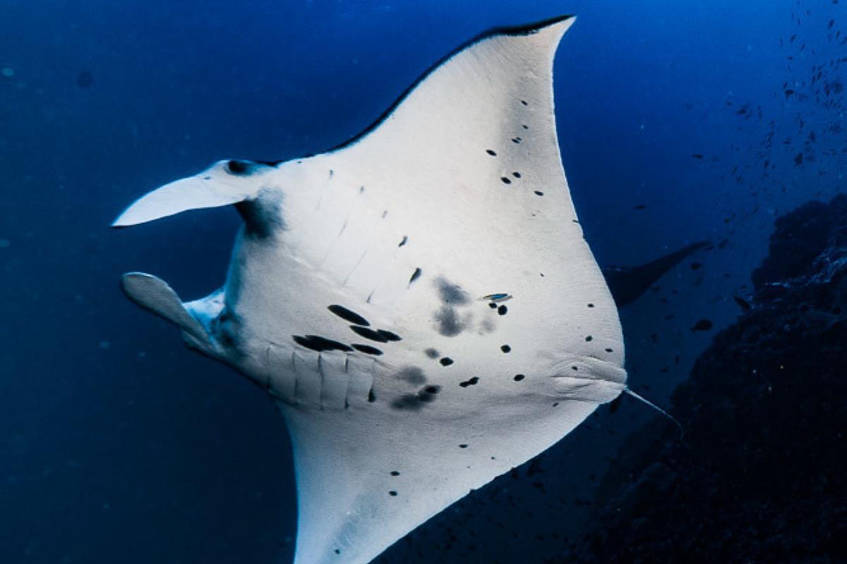 Ela se alimenta principalmente de plâncton, que captura enquanto nada lentamente perto da superfície. Esse comportamento faz com que seja uma das espécies mais fáceis de ser observada por mergulhadores e praticantes de snorkeling.