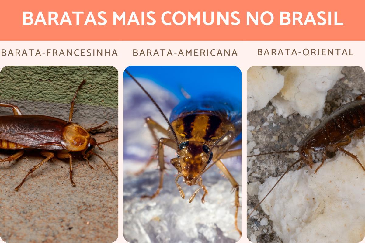 Você sabe quais são as espécies de baratas mais comuns encontradas no Brasil? Como você viu, esses insetos causam incômodo e representam uma ameaça à saúde, podendo transmitir doenças graves. Conhecer as principais características e hábitos desses animais pode ajudar a prevenir uma infestação indesejada. Confira abaixo os quatro tipos de baratas mais comuns no Brasil com seus respectivos nomes científicos: