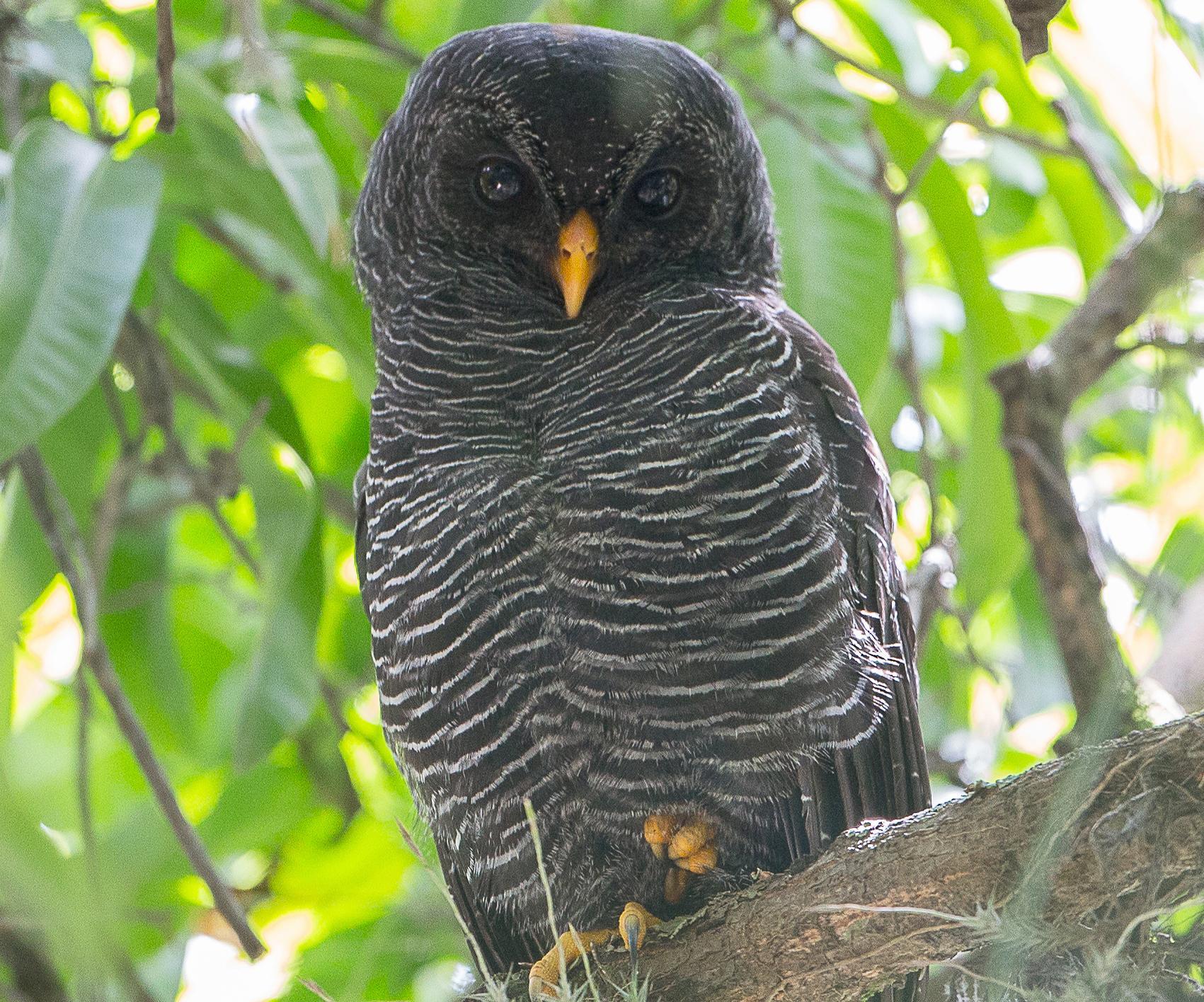 Típica da América do Sul, vive da Colômbia ao norte da Argentina. Mede aproximadamente de 35 a 40 cm. Este tipo de coruja pode ter hábitos solitários ou andar em casal. Sua coloração é muito marcante, pois possui um padrão manchado na área ventral, enquanto o resto do corpo é enegrecido. É comum vê-la nas faixas mais altas das florestas nas regiões onde vive.