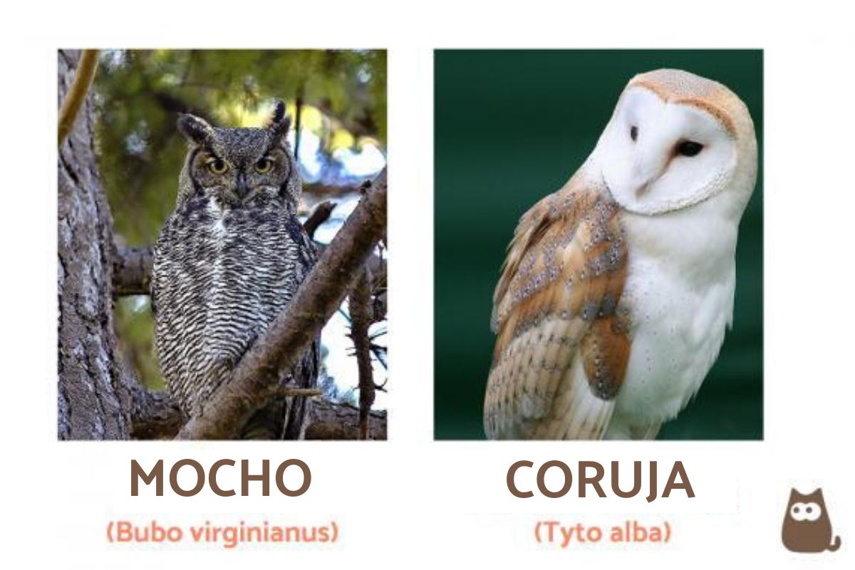 É muito comum confundir mochos e corujas, mas como vimos anteriormente, ambas diferem em pequenas características anatômicas, como as seguintes: