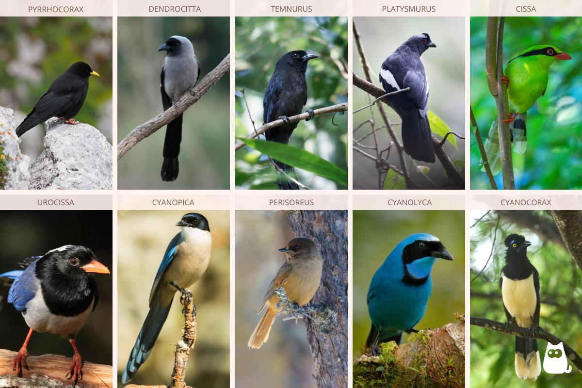 A família Corvidae inclui uma notável diversidade de gêneros distribuídos em quase todo o planeta, desde Europa, Ásia e África até a América. Entre os mais representativos encontram-se os seguintes: