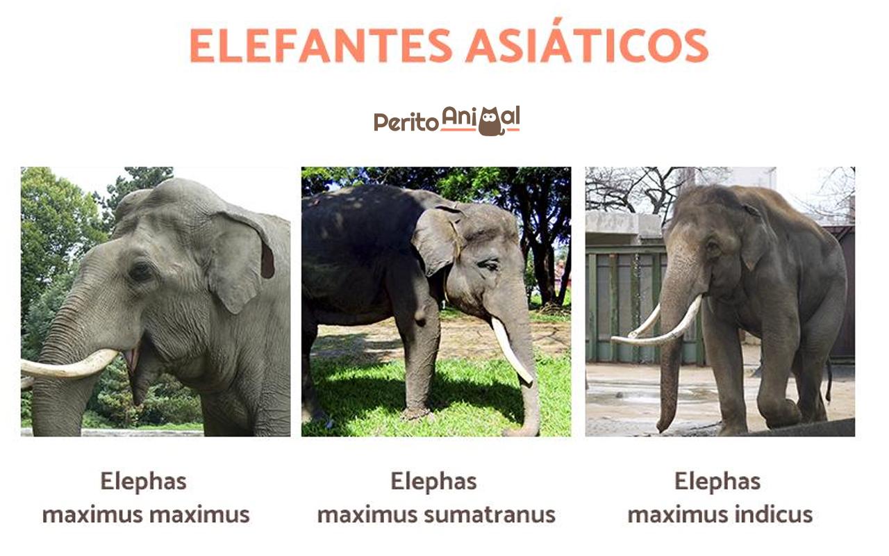 Os elefantes asiáticos habitam diferentes regiões da Ásia, como Índia, Tailândia ou Sri Lanka. Eles diferem dos africanos porque são menores e suas orelhas são proporcionalmente menores. Dentro do elefante asiático, existem três subespécies: